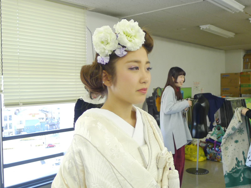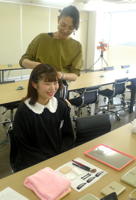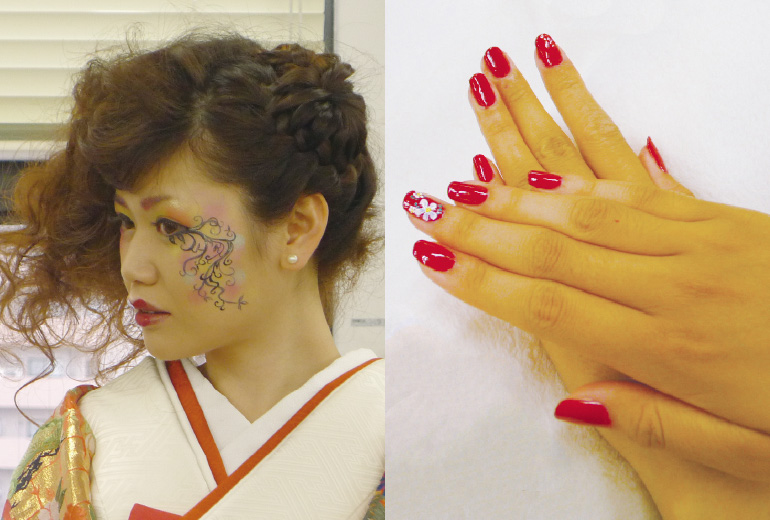 ヘアメイクでは、髪質、色、顔の形、個性に合わせてアレンジやスタイリングの技術を身につけます
