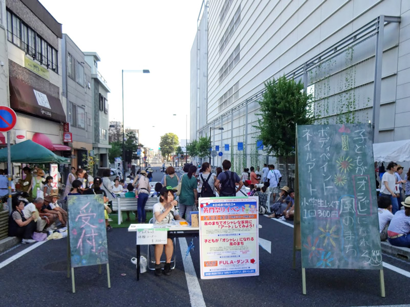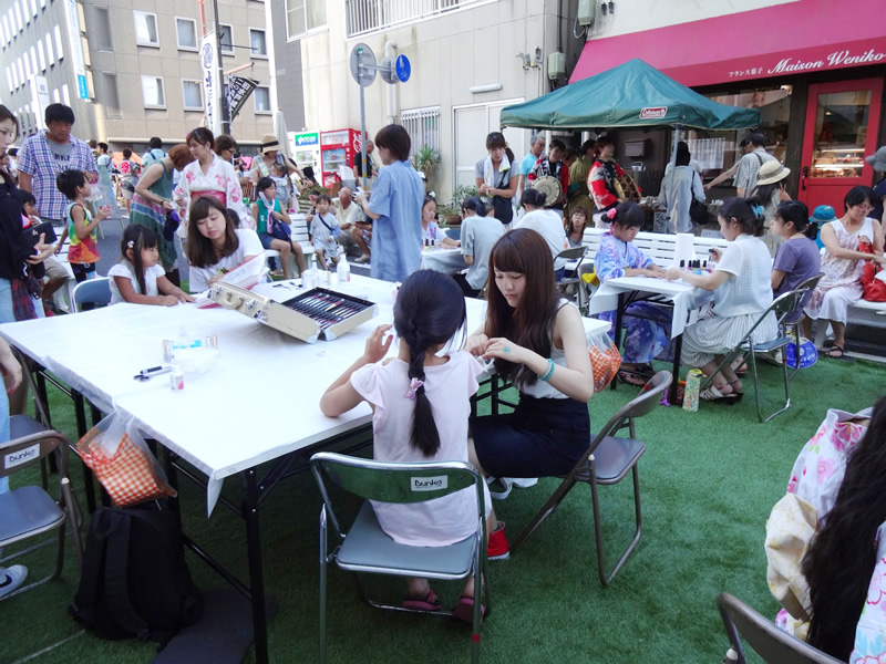 京成百貨店を囲むように店舗が並ぶ「京成通り商店会」商店会のみなさんと一緒にお祭りを盛り上げるため、ワークショップを行いました