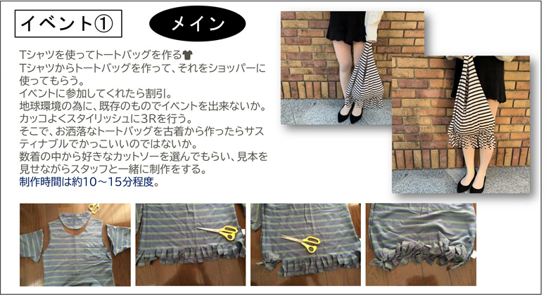 水戸オーパで運営するショップのイベントとして、Tシャツを使ったトートバック制作のワークショップを行いました
