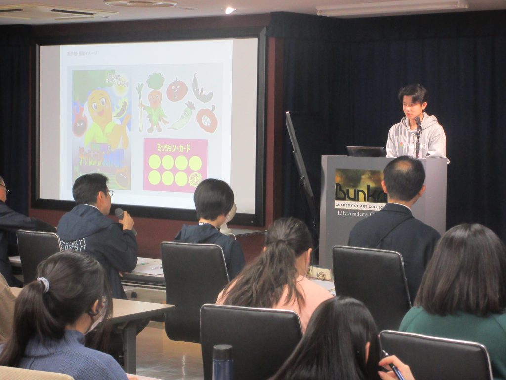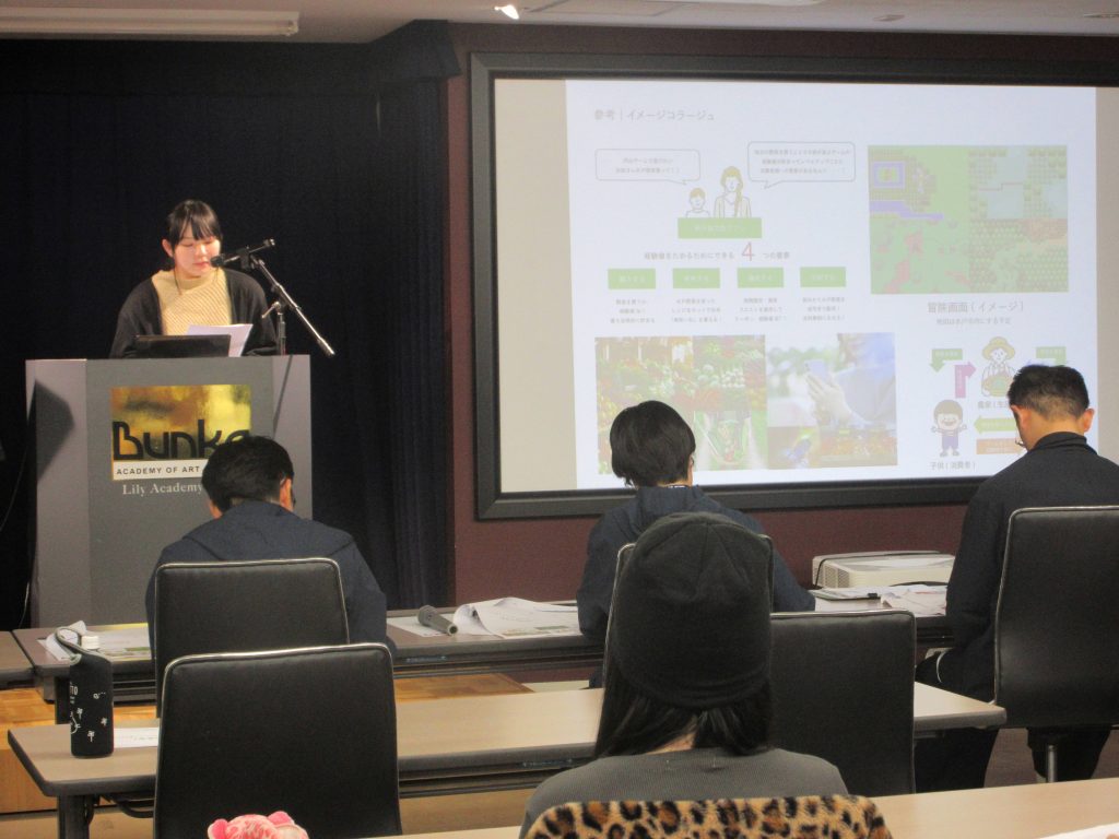 広告プロモーションデザイン学科2年生が修了制作の中間審査を行いました! 2025年10月25日(土) 広告プロモーションデザイン学科の2年生は今年の修了制作で 水戸市産業経済部農産復興課をクライアントに、 「水戸市の農産物を活用した地産地消プロモーション企画」の提案に取り組みます。 10月24日(金)に水戸市産業経済部農産復興課の方々に お越しいただき、中間審査を行いました。 学生たちは、どうすれば市民の関心を高めて 地産地消に積極的に参加してもらえるのかを考え、 スマホアプリの開発や店舗のプロデュースなど 様々なプロモーション企画の提案を行いました。 今回いただいたアドバイスを基に 最終プレゼンに向けてブラッシュアップをしていきます! お忙しい中ご出席いただいた 水戸市産業経済部農産復興課の皆様 ありがとうございました。 ∴‥∵‥∴‥∵‥∴‥∴‥∵‥∴‥‥∵‥∴‥∵‥∴‥∴‥∵‥∴‥ 体験入学会では参加した学生の話や昨年の作品を見ることができます! ぜひ一度遊びに来てみてください☆彡 ↓体験入学のスケジュールや内容は下記をチェック↓ https://bunka-gakuen.ac.jp/opencampus/index.html ∴‥∵‥∴‥∵‥∴‥∴‥∵‥∴‥‥∵‥∴‥∵‥∴‥∴‥∵‥∴‥ 前の記事へ環境セミナー参加者募集中です!  学科ラインナップ 広告プロモーションデザイン学科 ファッションビジネス学科 建築設計デザイン学科 HOME PAGE TOP