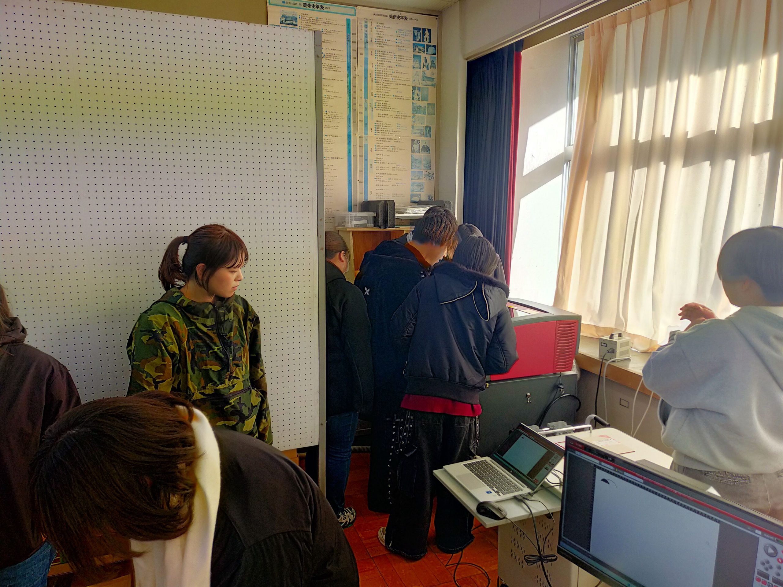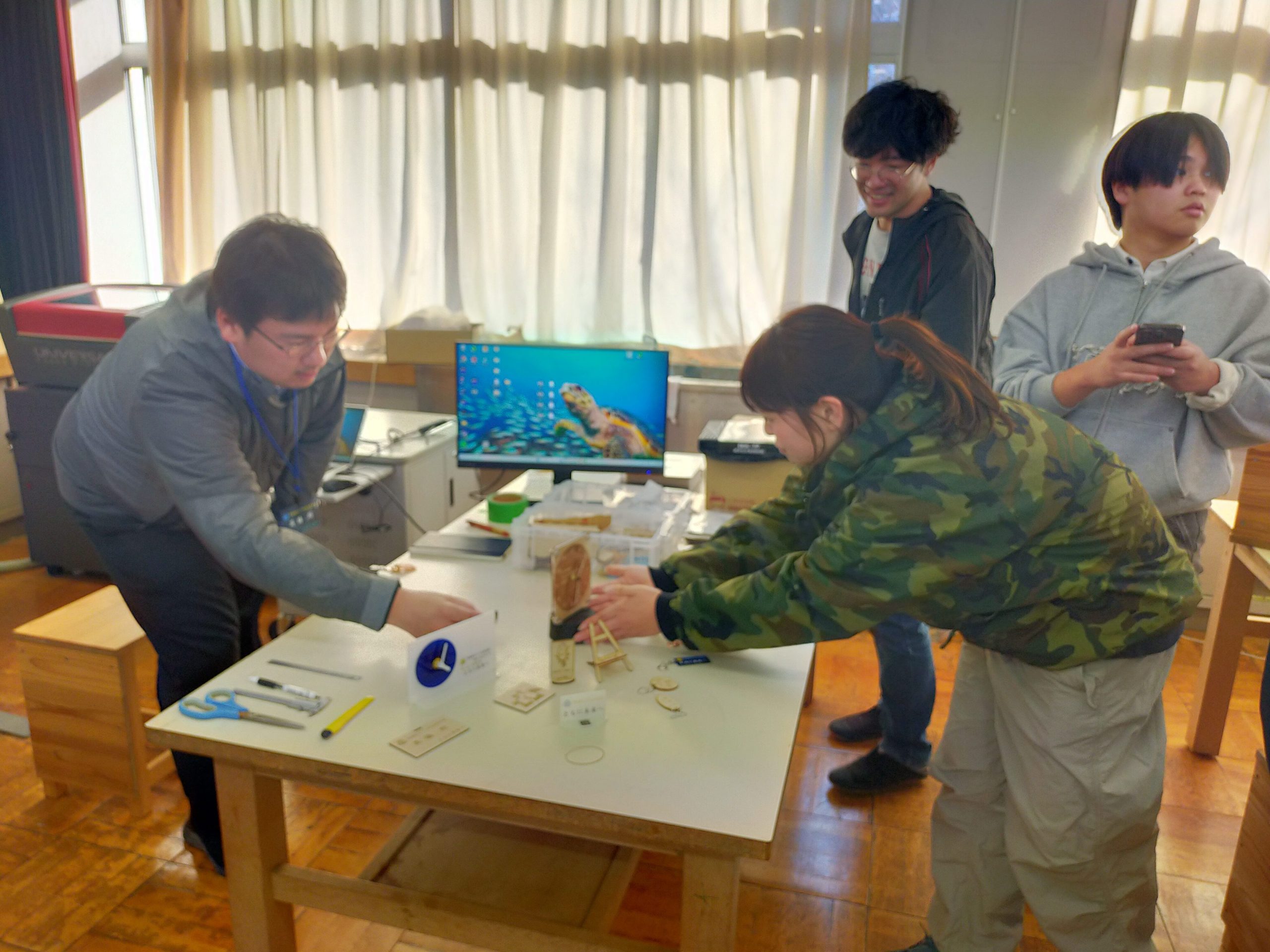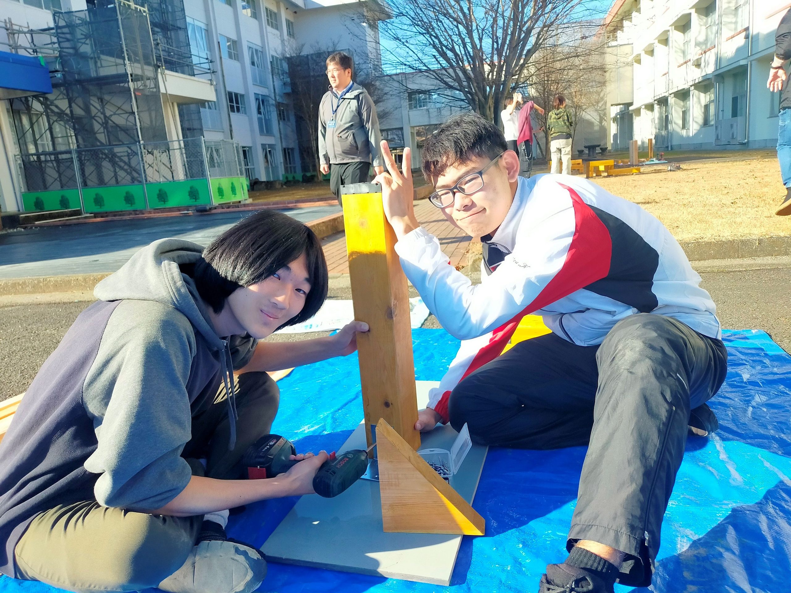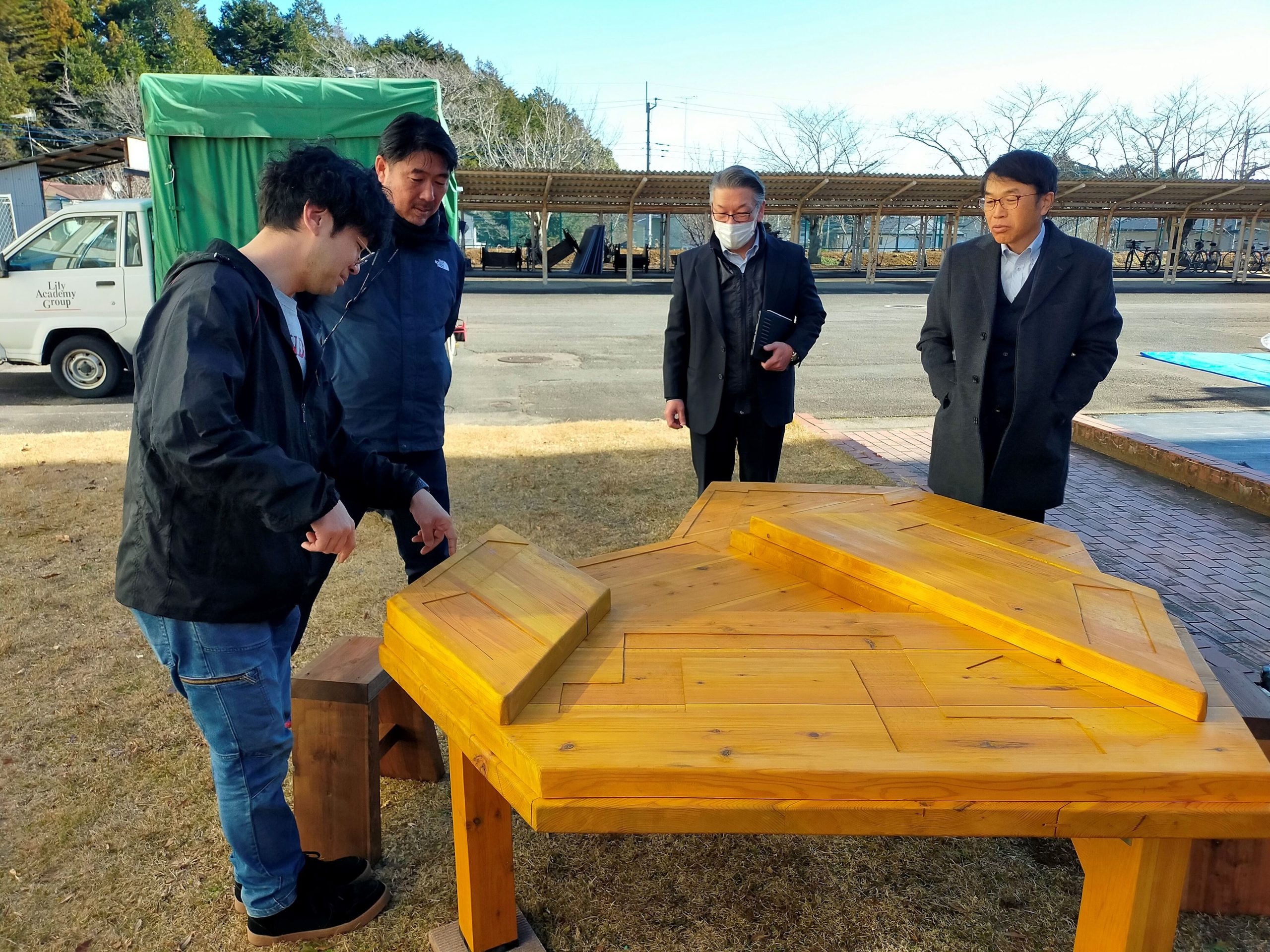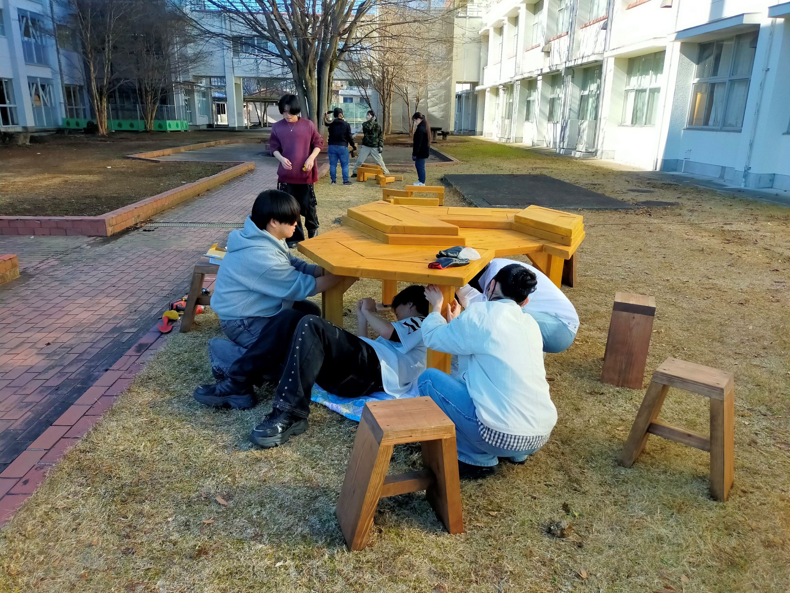 IT未来高校「中庭プロジェクト」設置作業を行いました! 2026年1月21日(水) 1/8(木)に建築設計デザイン学科2年生は、プレゼンテーションで採用されたデザイン案をもとに 約1か月の短い制作期間ではありましたが、一生懸命作業を行ったおかげで本日の設置日に間に合いました! 【IT未来高校「中庭プロジェクト」制作中!についてはこちらから】 また、IT未来高校の辻校長先生からも貴重なお話を頂きました。 その後は、材料を降ろし早速作業に取り掛かります! 高校生にも作業のお手伝いをしてもらいました! はじめての電動ドリルにもあっという間になれてしまいました。 体を使う作業は覚えも早いものですね! 学生たちも手分けして順調に作業が進んでいきます! 予定通り午前中に設置作業は完了しました! IT未来高校の先生方が様子を見に来ていただき、素晴らしい評価を頂きました! 学生たちも一安心ですね! 午後はIT未来高校のレーザー加工機で作業です。 初めての機会に興味津々!頼むから壊さないでくれ…(汗) 加工したアクリル板を設置して無事にテーブルが完成しました! 今回、初めて高校生との連携作業になりましたが、 学生や高校生にとって非常に貴重な体験になったと思います! 今回ご協力いただきましたIT未来高校の皆様、笠間広域森林組合様、塙製材所様、 誠にありがとうございました。 ∴‥∵‥∴‥∵‥∴‥∴‥∵‥∴‥‥∵‥∴‥∵‥∴‥∴‥∵‥∴‥ 体験入学会では授業の内容が詳しくわかり、 体験授業でデザインの楽しさに触れることができます♪ ぜひ一度遊びに来てみてください☆彡 ↓体験入学のスケジュールや内容は下記をチェック↓ https://bunka-gakuen.ac.jp/opencampus/index.html ∴‥∵‥∴‥∵‥∴‥∴‥∵‥∴‥‥∵‥∴‥∵‥∴‥∴‥∵‥∴‥ 前の記事へIT未来高校「中庭プロジェクト」制作中! 学科ラインナップ 広告プロモーションデザイン学科 ファッションビジネス学科 建築設計デザイン学科 HOME PAGE TOP